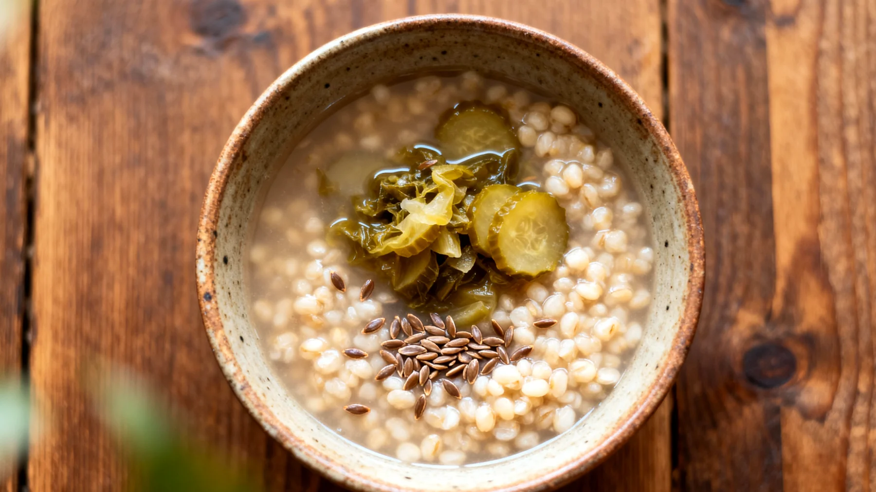 L’orzo richiede circa 40-45 minuti di cottura per raggiungere una consistenza cremosa. Cuocetelo nel brodo vegetale insieme alle verdure fresche, aggiungendo i fermentati solo negli ultimi 2-3 minuti. Al momento di servire, completate con i semi di lino macinati e, se gradite, un filo di olio extravergine di oliva a crudo, in linea con il modello di dieta mediterranea.